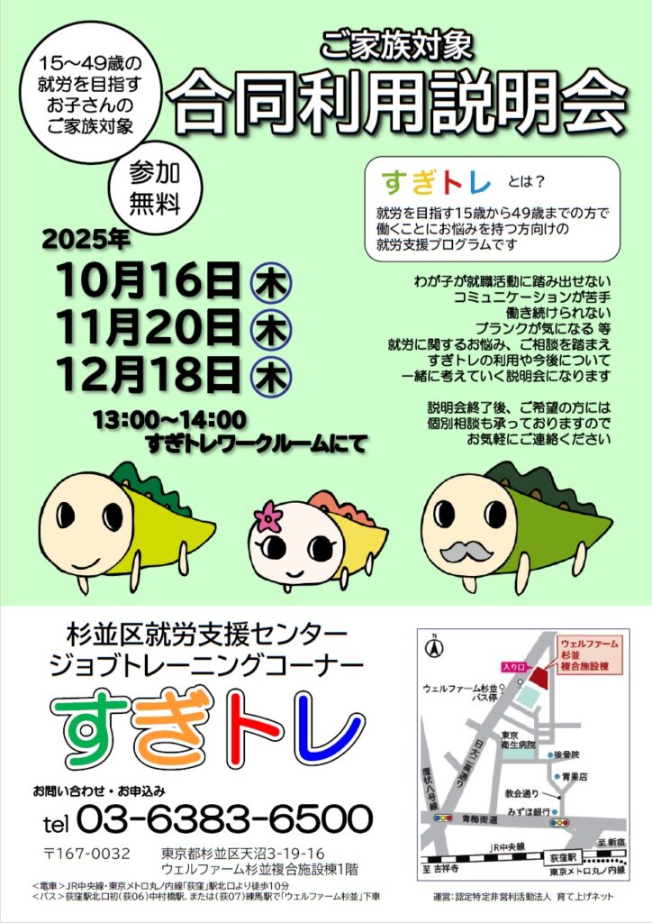 杉並区就労支援センター・ジョブトレーニングコーナー【すぎトレ】では、就労を目指す15歳~49歳までの方、または、そのご家族の方を支援しています。ご家族(お子様、お孫さん、親戚の方・・など)の就労について不安や悩みがある方、相談したいがどのように進めればよいか分からない方など、どんなことでもお問合せ頂ければ、【すぎトレ】で相談を受付けています。まずは、月に1回開催されている相談会にご参加ください。お電話番号は TEL:03-6383-6500(平日 月~金 9:00~17:00)。時間の合わない方は、個別相談も行っております。
