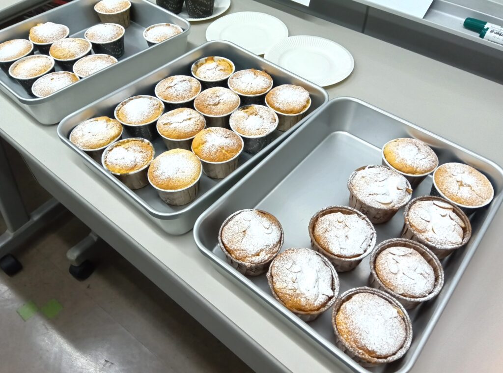 お祭りの午前中にお菓子作りに興味のあるメンバーが参加してカップケーキを作りました。ナッツの入ったものやシュガーパウダーの乗ったものなどどれもおいしくできました。このケーキをゲーム大会で食べながらみんなでお祭り開始です。