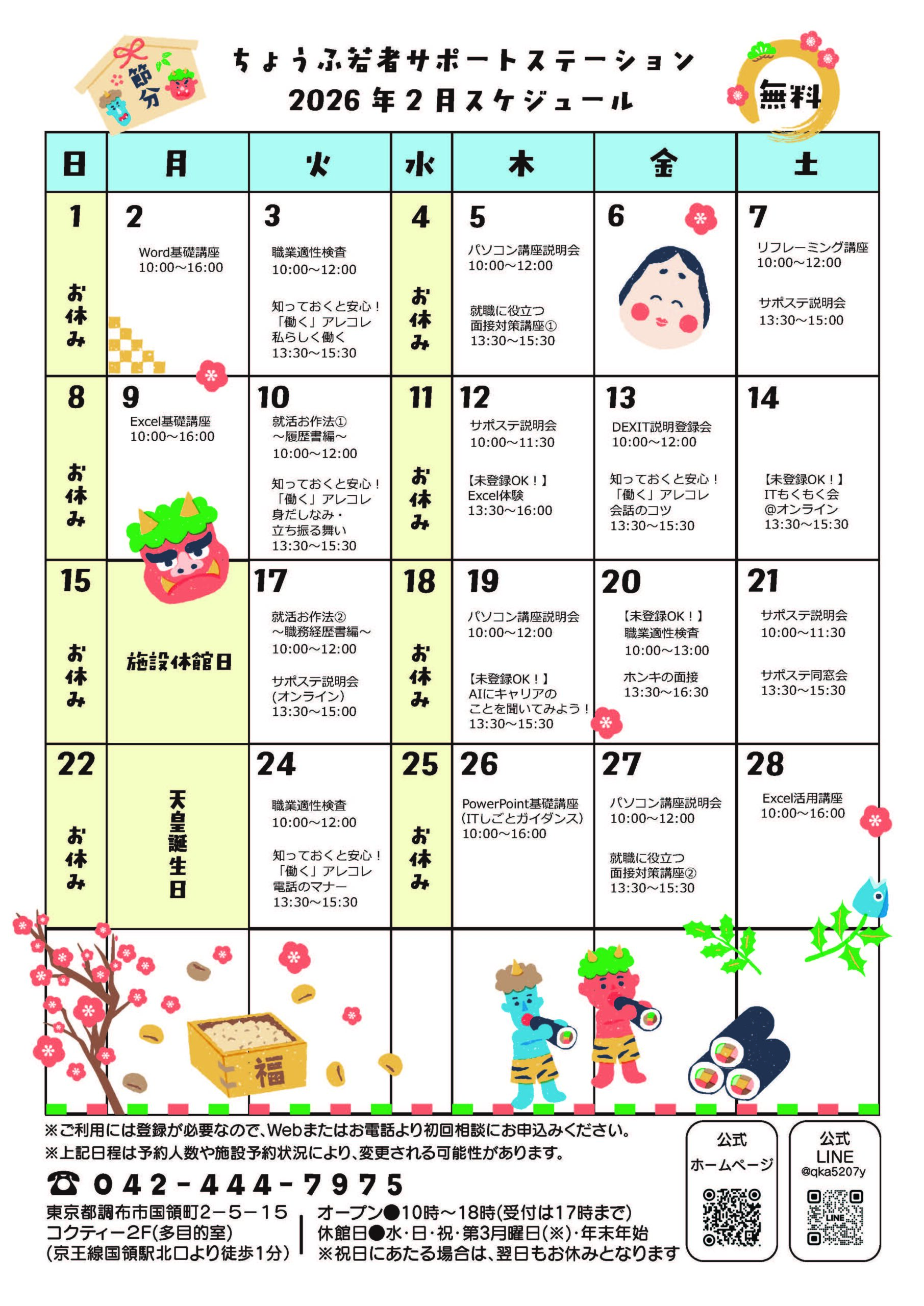 2026.01.15お知らせ 2月スケジュールを公開しました ▶2026年2月のスケジュールを公開しました。 PDFデータはこちら ▶登録なし・お試しで参加できるセミナー の詳細・お申込みはこちら ▶その他のセミナー情報はプログラム紹介ページから *講座参加には利用登録が必要です。まずは初めてのご相談にお申込みください。 ご予約をお待ちしています! ちょうふ若者サポートステーション TEL:042-444-7975 BACK