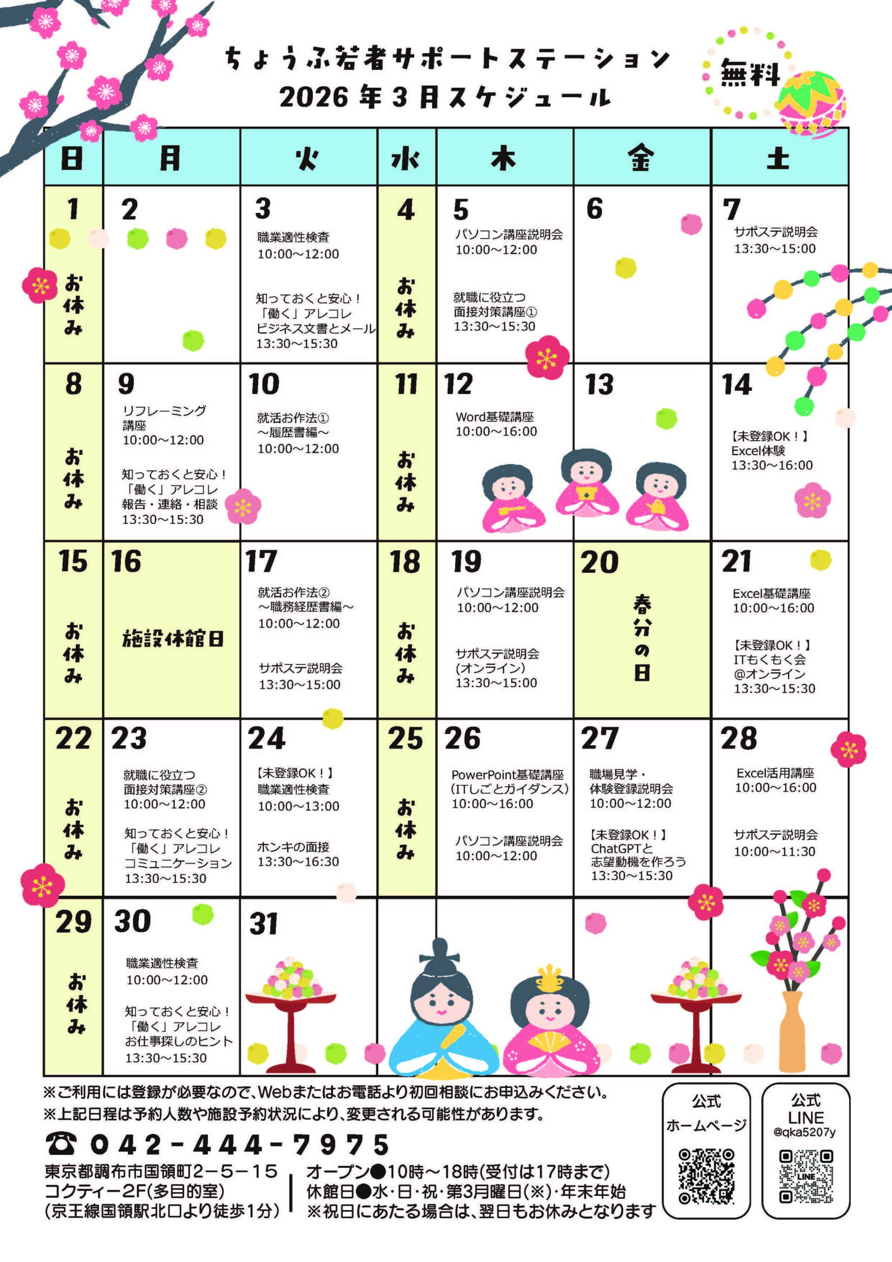 2026.02.13お知らせ 3月スケジュールを公開しました ▶2026年3月のスケジュールを公開しました。 PDFデータはこちら ▶登録なし・お試しで参加できるセミナー の詳細・お申込みはこちら ▶その他のセミナー情報はプログラム紹介ページから *講座参加には利用登録が必要です。まずは初めてのご相談にお申込みください。 ご予約をお待ちしています! ちょうふ若者サポートステーション TEL:042-444-7975 BACK
