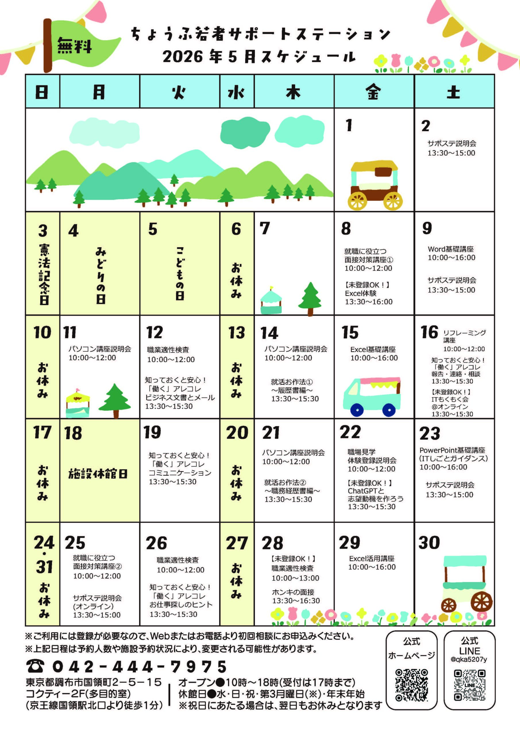 2026.04.15お知らせ 【5月】スケジュールを公開しました ▶2026年5月のスケジュールを公開しました。 PDFデータはこちら ▶登録なし・お試しで参加できるセミナー の詳細・お申込みはこちら ▶その他のセミナー情報はプログラム紹介ページから *講座参加には利用登録が必要です。まずは初めてのご相談にお申込みください。 ご予約をお待ちしています! ちょうふ若者サポートステーション TEL:042-444-7975 BACK