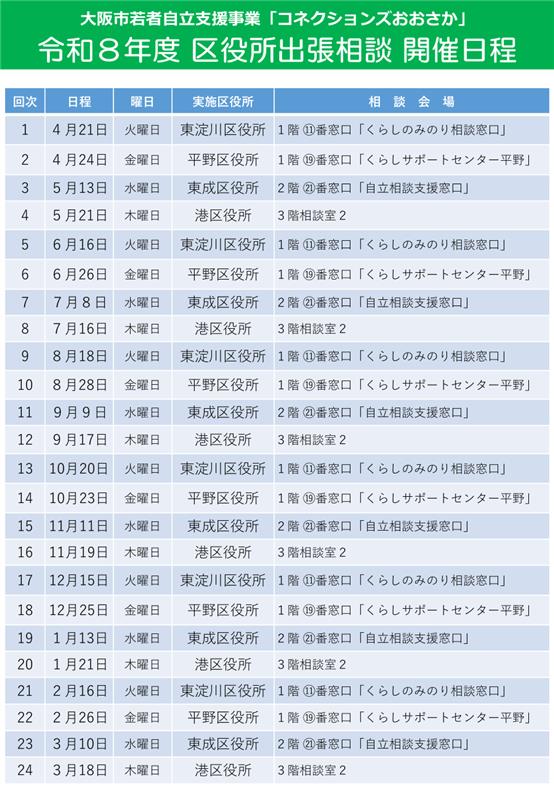 コネクションズおおさかでは、東成区港区東淀川区平野区で出張相談を実施しております。